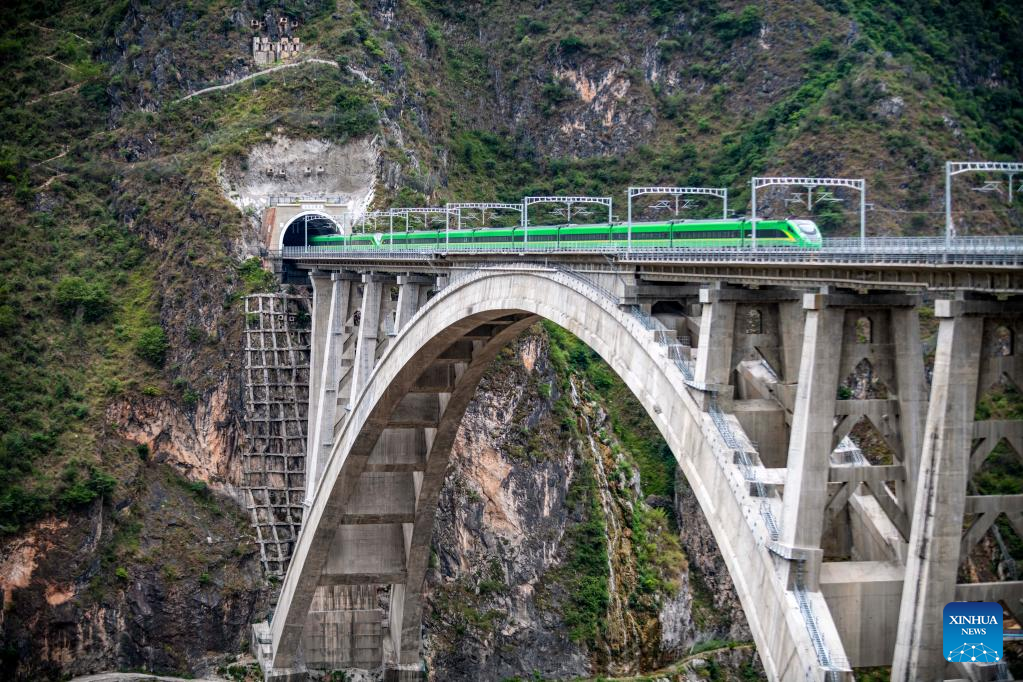 A bullet train runs for trial on the Lancang River super major bridge along the Dali-Baoshan section of Dali-Ruili Railway in southwest China's Yunnan Province, July 19, 2022.