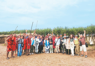 Chinese tourists pose for a photo with members of a tribe in Maasai village in the Maasai Mara National Reserve, Kenya. (Photo courtesy of U-tour)