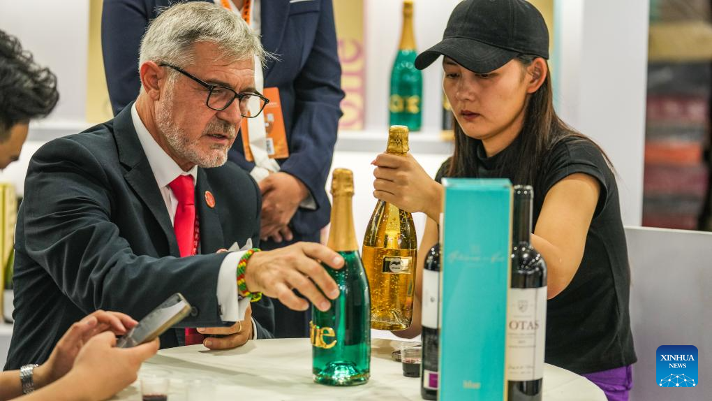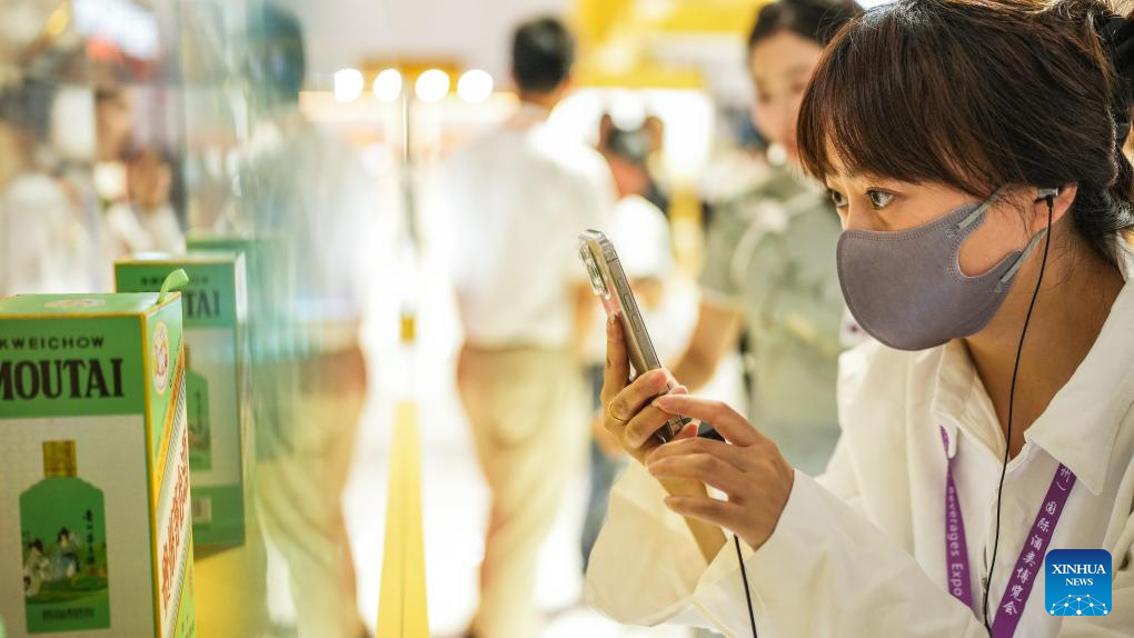 People taste alcoholic beverage products at the 13th China (Guizhou) International Alcoholic Beverages Expo in Guiyang, southwest China's Guizhou Province, Sept. 9, 2024. The four-day China (Guizhou) International Alcoholic Beverages Expo kicked off here Monday. (Xinhua/Tao Liang)