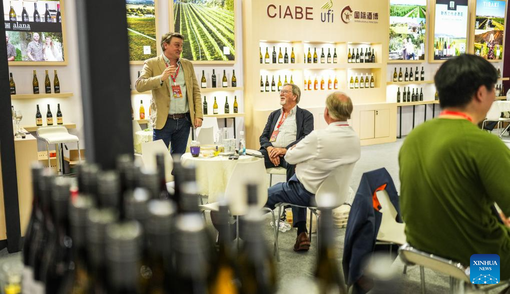 Exhibitors communicate during the 13th China (Guizhou) International Alcoholic Beverages Expo in Guiyang, southwest China's Guizhou Province, Sept. 9, 2024. The four-day China (Guizhou) International Alcoholic Beverages Expo kicked off here Monday. (Xinhua/Tao Liang)