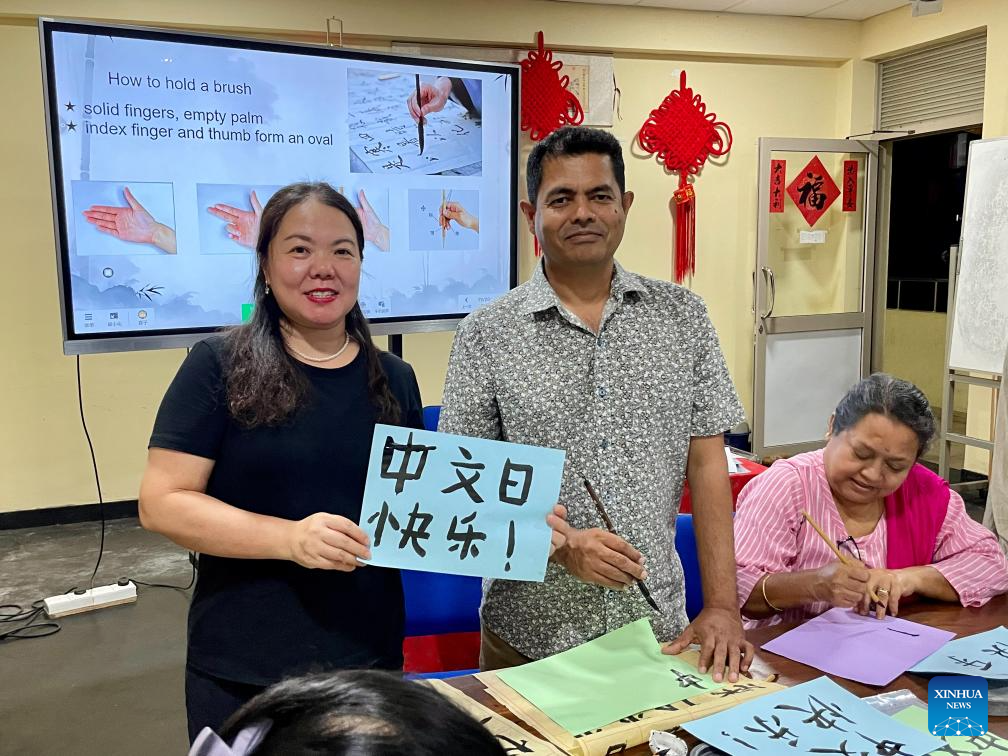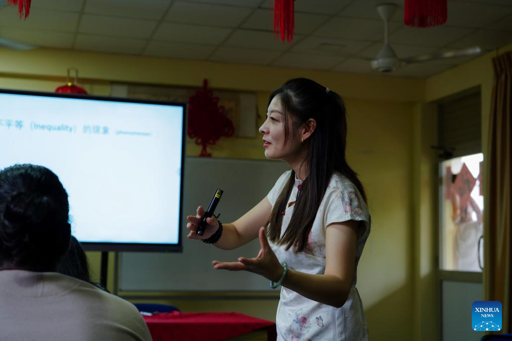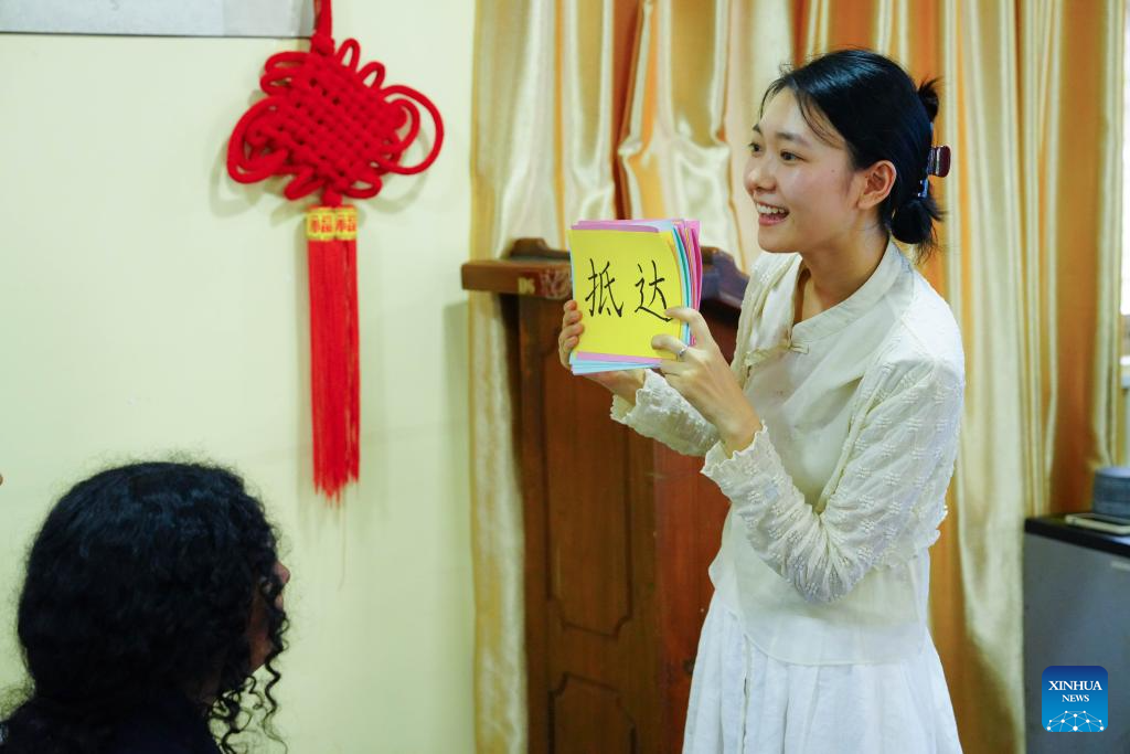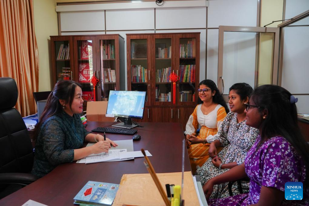 Chinese teacher Xia Zihan teaches students majoring in Chinese at Confucius Classroom in Sabaragamuwa University in the southern foothills of Sri Lanka's central mountains, Sept. 4, 2024. (Xinhua/Wu Yue)