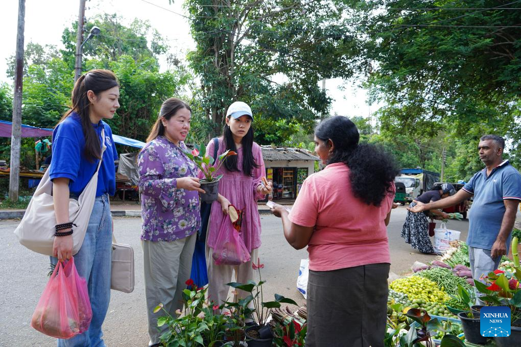 Director of Confucius Classroom of Sabaragamuwa University Zhu Song (2nd L), Chinese teachers Xia Zihan (3rd L) and Zhang Huan (1st L) shop at a traditional weekly market near the university in the southern foothills of Sri Lanka's central mountains, Sept. 5, 2024. (Xinhua/Chen Dongshu)