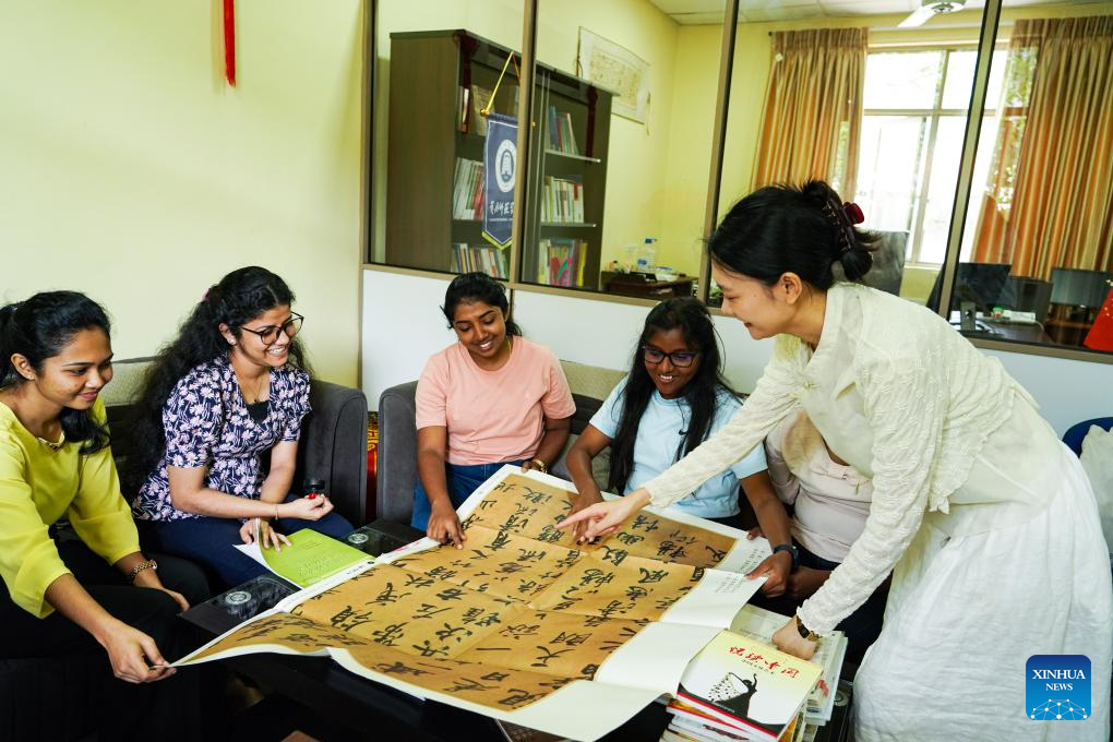 Chinese teacher Xia Zihan (1st R) introduces Chinese calligraphy work to students majoring in Chinese at Confucius Classroom in Sabaragamuwa University in the southern foothills of Sri Lanka's central mountains, Sept. 4, 2024. (Xinhua/Chen Dongshu)