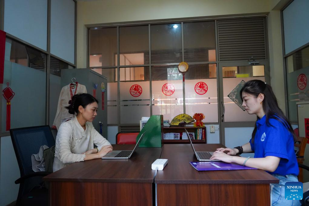 Chinese teacher Zhang Huan (R) and Xia Zihan work at their office in Sabaragamuwa University in the southern foothills of Sri Lanka's central mountains, Sept. 4, 2024. (Xinhua/Chen Dongshu)