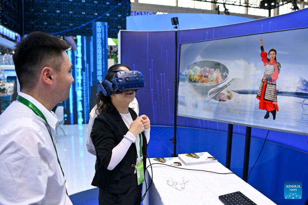 A visitor tries a VR device at an industrial expo during the 2024 Taiyuan Energy Low Carbon Development Forum in Taiyuan, north China's Shanxi Province, Sept. 10, 2024. (Xinhua/Yang Chenguang)