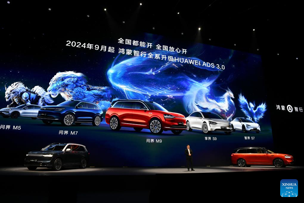 Huawei announces that all vehicles powered by the company's Harmony Intelligent Mobility Alliance (HIMA) have been updated to Huawei ADS 3.0 intelligent driving system during a new products release event in Shenzhen, south China's Guangdong Province, Sept. 10, 2024. China's technology giant Huawei unveiled the world's first commercial tri-fold smartphone, the Mate XT, during a new products release event here Tuesday. A new edition of Aito M9 and newly released Luxeed R7, both powered by Huawei's Harmony Intelligent Mobility Alliance (HIMA), were also released during the event. (Xinhua/Liang Xu)