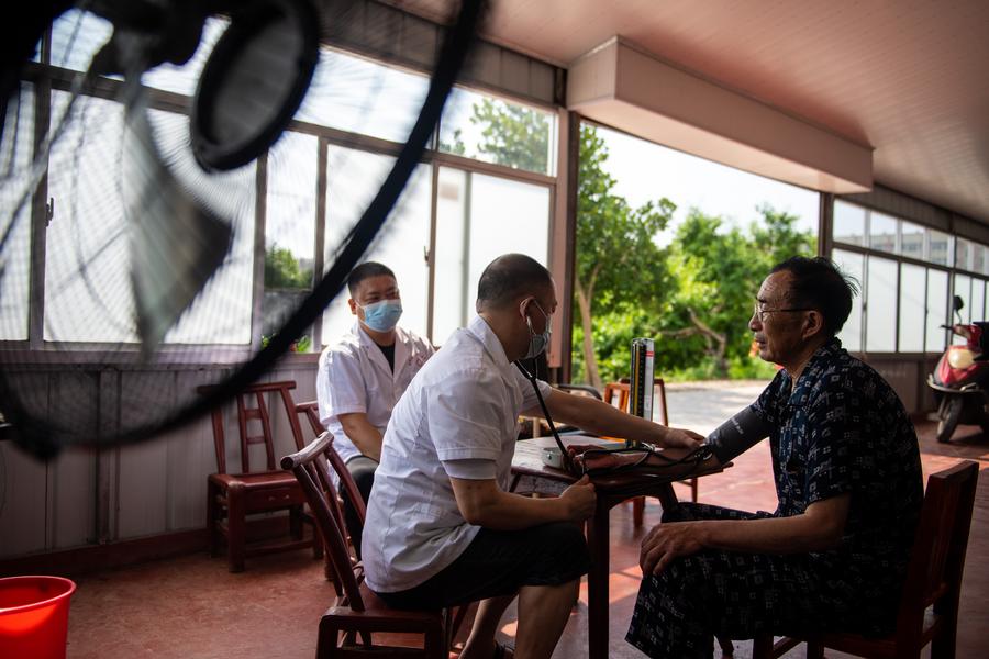 A medical worker measures blood pressure for a senior resident at a community in Anxiang County of Changde City, central China's Hunan Province, June 21, 2023. (Xinhua/Chen Sihan)