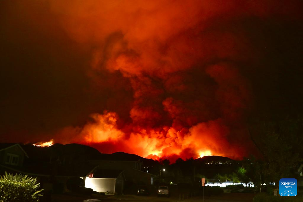 Massive flames and heavy smoke are seen in Trabuco Canyon, Orange County, California, the United States, on Sept. 10, 2024. Three fast-moving wildfires continued to burn in Southern California Tuesday as millions of residents in the region are still under an excessive heat warning. (Photo by Qiu Chen/Xinhua)