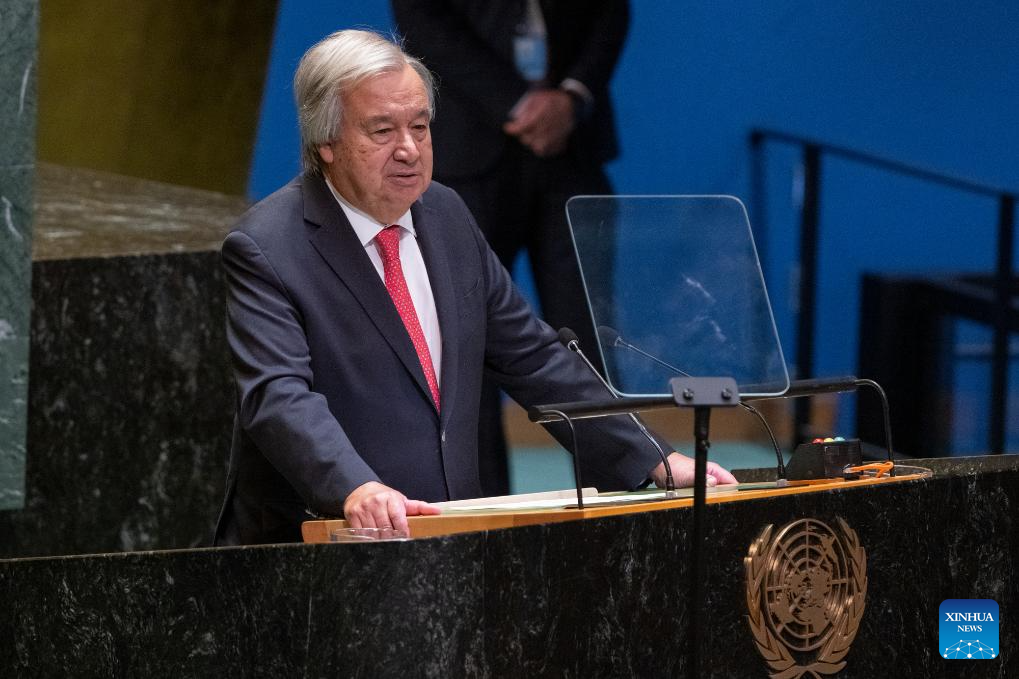 UN Secretary-General Antonio Guterres speaks at the first plenary meeting of the 79th session of UN General Assembly at the UN headquarters in New York, on Sept. 10, 2024. The 79th session of the UN General Assembly (UNGA) was declared open on Tuesday by Philemon Yang, the General Assembly's new president. (Eskinder Debebe/UN Photo/Handout via Xinhua)