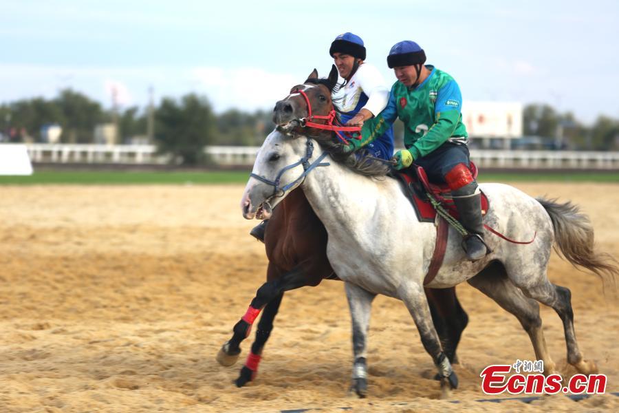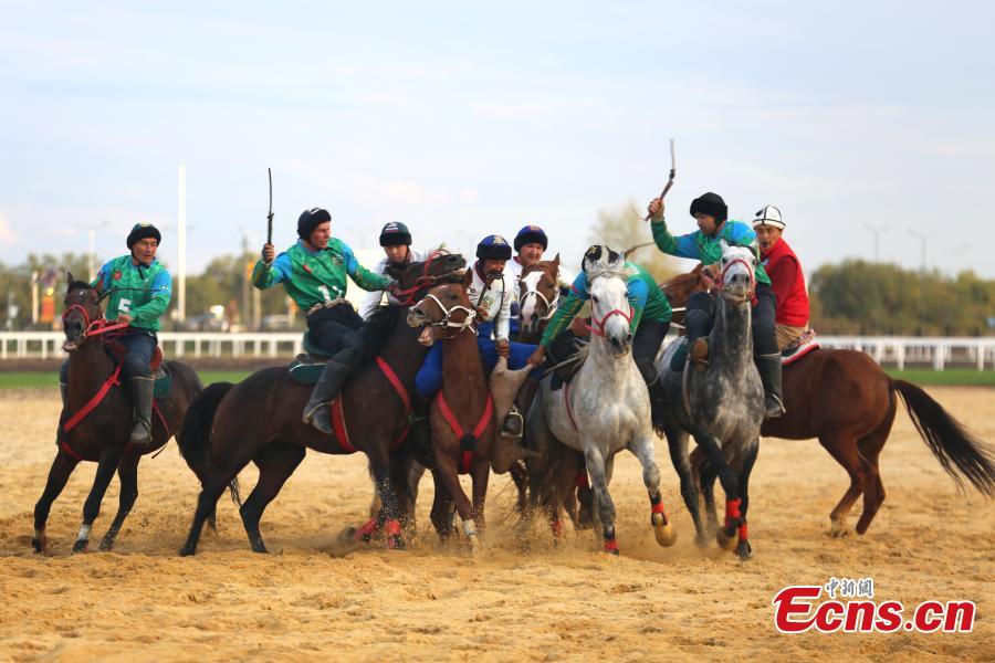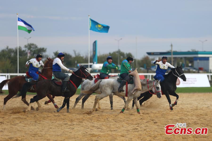 Competitors participate in a sheep-scrambling competition during the 5th World Nomad Games held in Astana, Kazakhstan, Sept. 10, 2024. (Photo: China News Service/Shan Lu)