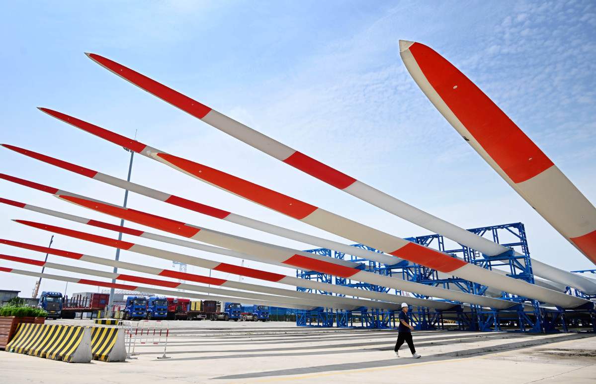 Wind turbine blades at a port in Yantai, Shandong province, in August. (Photo/Xinhua)