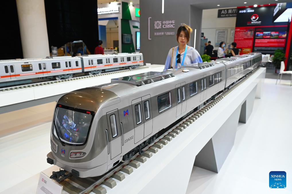 A visitor views a model of Xiamen Metro train at the exhibition of BRICS New Industrial Revolution 2024 in Xiamen, southeast China's Fujian Province, Sept. 10, 2024. The BRICS Forum on Partnership on New Industrial Revolution 2024 opened here on Tuesday, with the theme "Fostering high-quality partnership and embarking on a new journey of new industrialization." (Xinhua/Lin Shanchuan)
