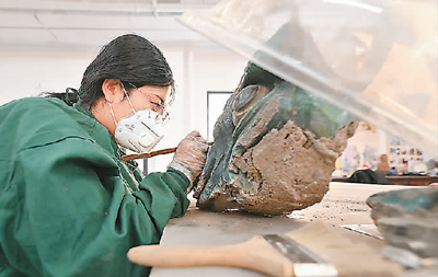 A technician with the Yungang Grottoes Research Institute removes dusts from a piece of relic in Datong city, north China's Shanxi Province. (Xinhua/Zhan Yan)