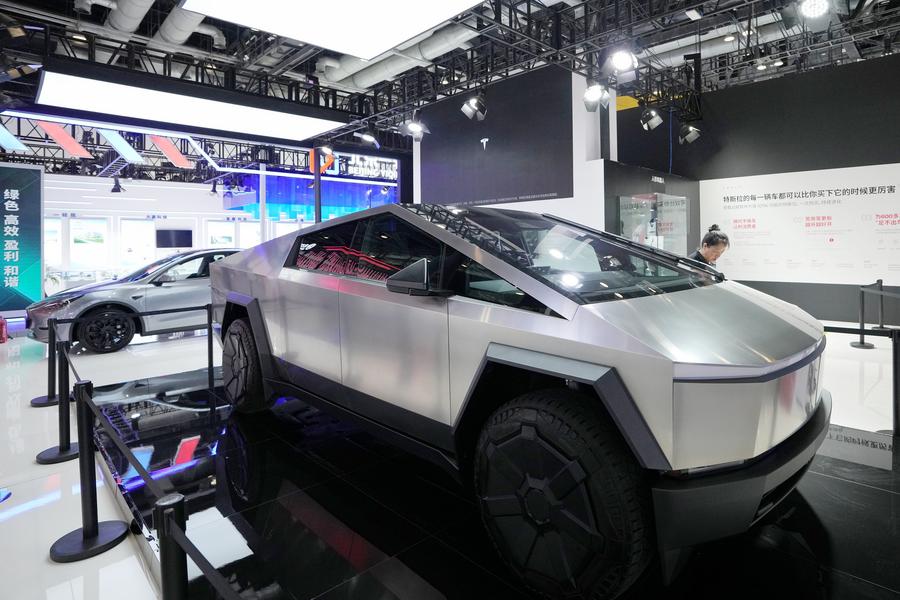 This photo taken on Sept. 11, 2024 shows the pavilion of Tesla at the China National Convention Center in Beijing, capital of China. (Xinhua/Ju Huanzong)