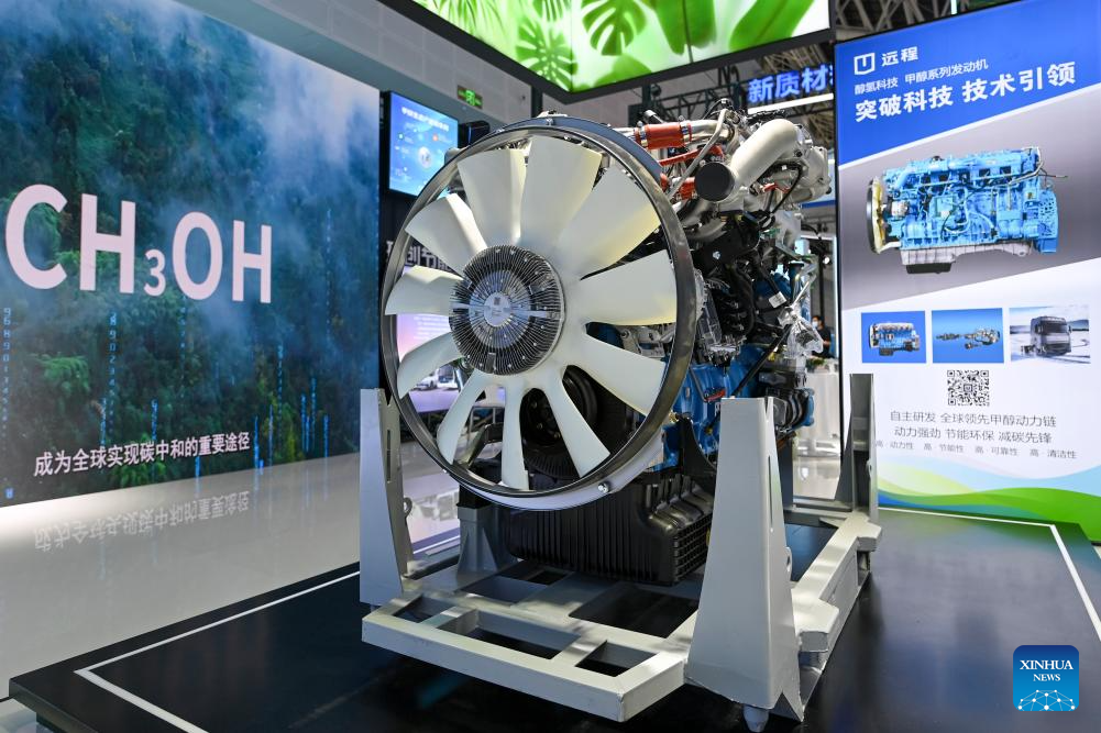 A methanol engine is on display at China (Taiyuan) International Energy Industry Expo 2024 in Taiyuan, north China's Shanxi Province, Sept. 11, 2024. The expo, which features special exhibition areas like wind power and photovoltaics, new energy storage, new energy vehicle and etc., is designed to demonstrate new technologies and products in the energy field. (Xinhua/Yang Chenguang)