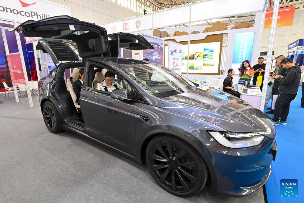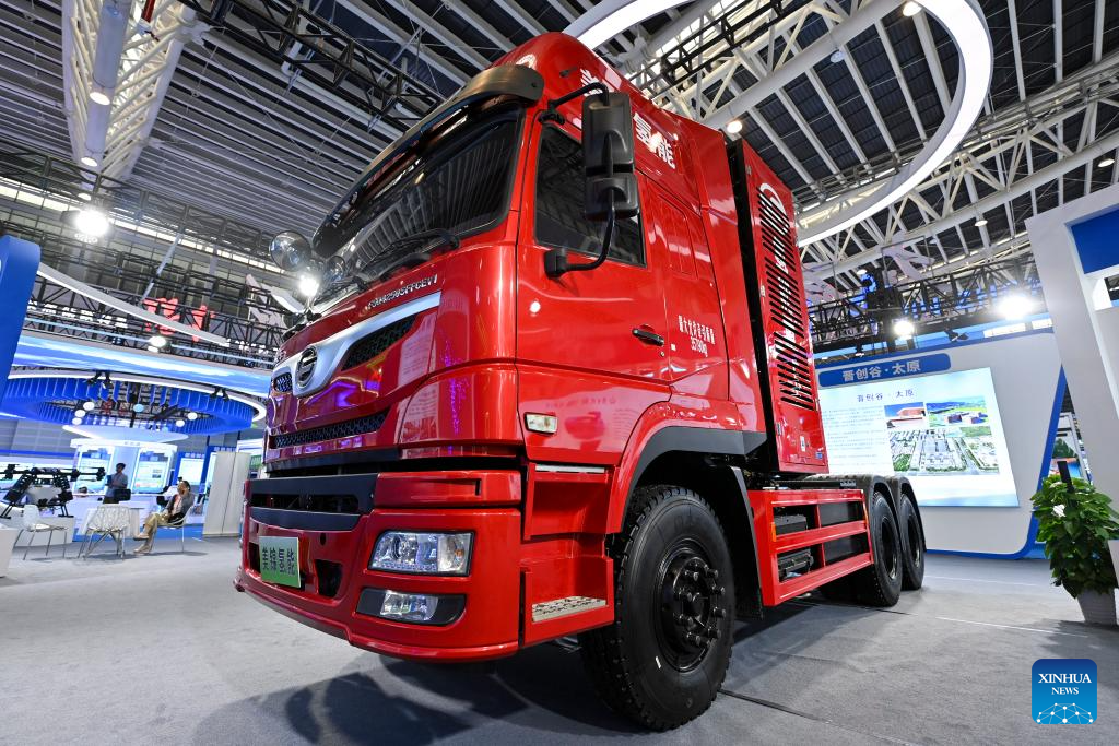 A new energy vehicle is on display at China (Taiyuan) International Energy Industry Expo 2024 in Taiyuan, north China's Shanxi Province, Sept. 11, 2024. The expo, which features special exhibition areas like wind power and photovoltaics, new energy storage, new energy vehicle and etc., is designed to demonstrate new technologies and products in the energy field. (Xinhua/Yang Chenguang)