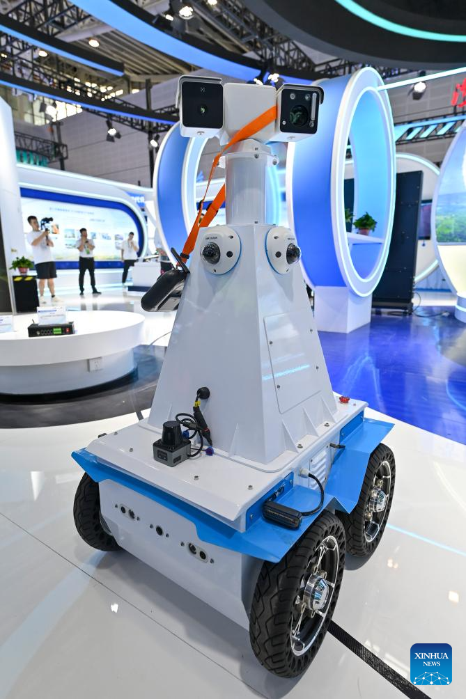 A mine patrol robot is on display at China (Taiyuan) International Energy Industry Expo 2024 in Taiyuan, north China's Shanxi Province, Sept. 11, 2024. The expo, which features special exhibition areas like wind power and photovoltaics, new energy storage, new energy vehicle and etc., is designed to demonstrate new technologies and products in the energy field. (Xinhua/Yang Chenguang)