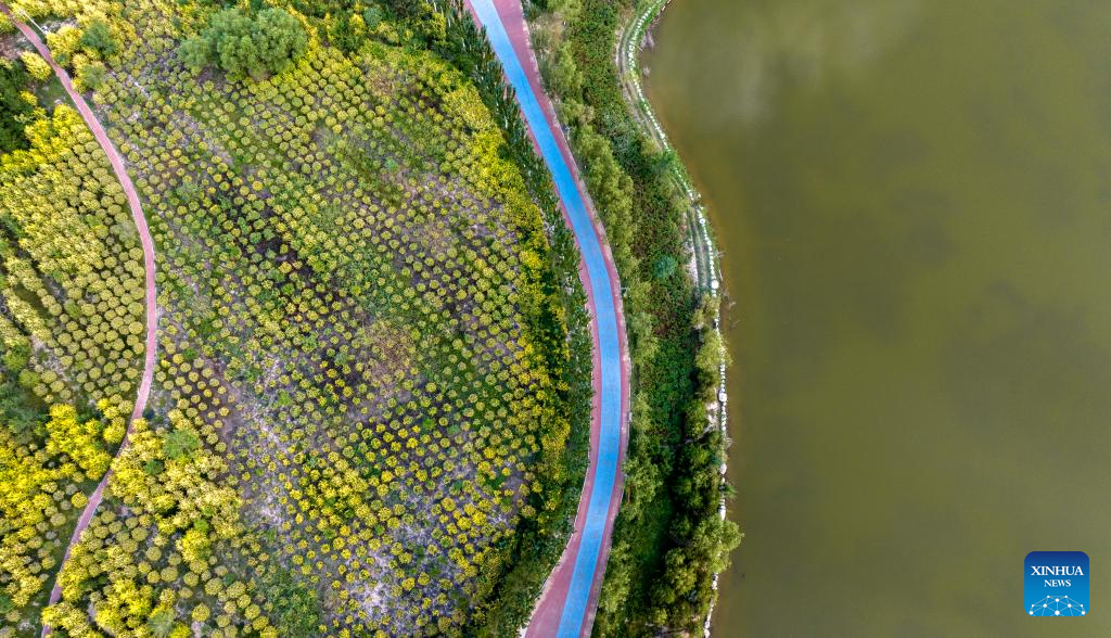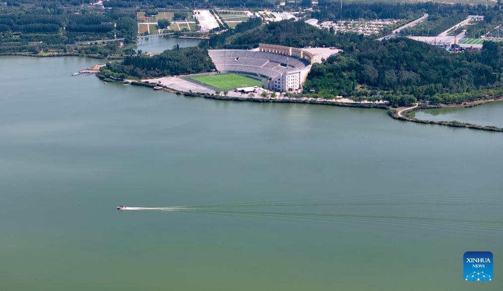 An aerial drone photo taken on Aug. 22, 2024 shows a fitness trail in the Zhangzi Lake eco-tourism area in Xingqing District of Yinchuan, northwest China's Ningxia Hui Autonomous Region. (Xinhua/Yang Zhisen)