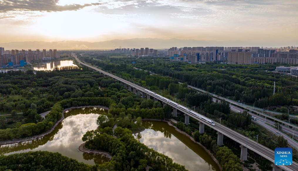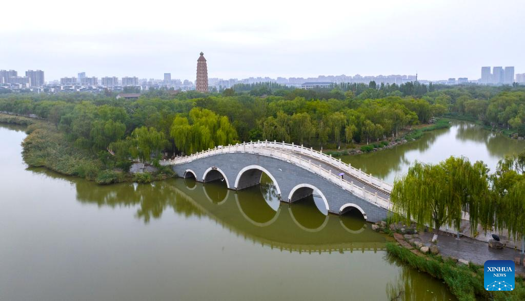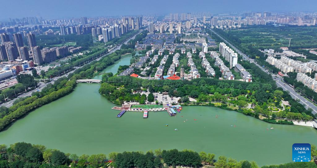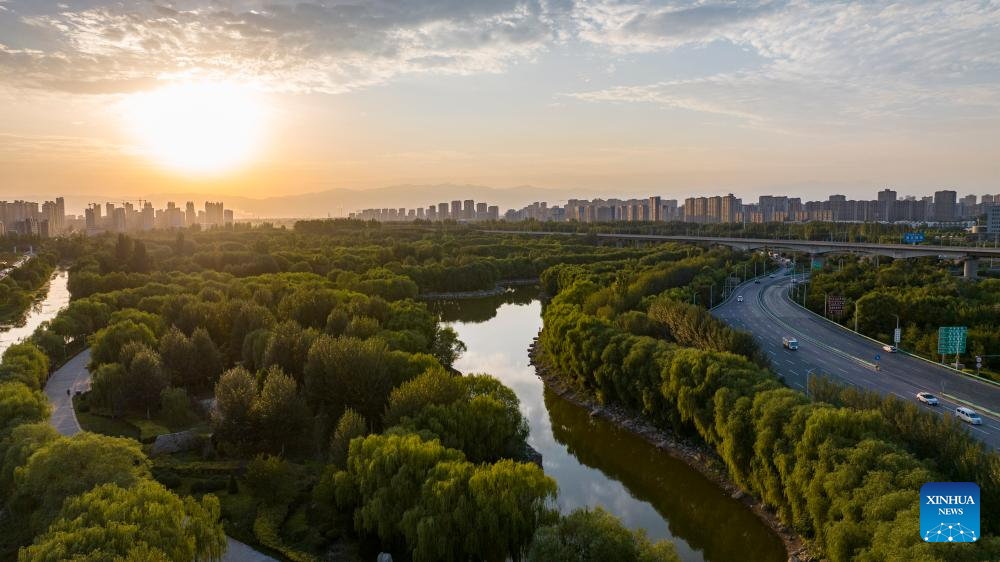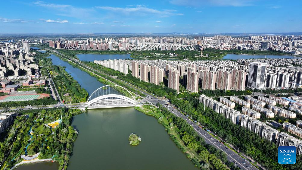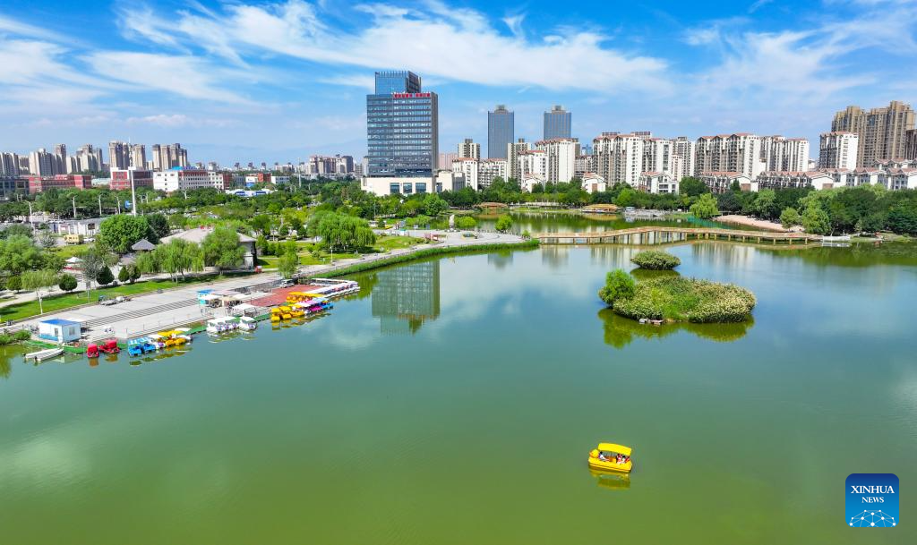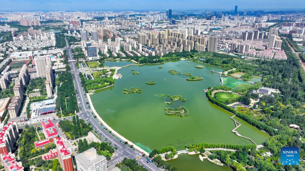 An aerial drone photo taken on Aug. 22, 2024 shows a view in Lailong park in Xingqing District of Yinchuan, northwest China's Ningxia Hui Autonomous Region. (Xinhua/Yang Zhisen)