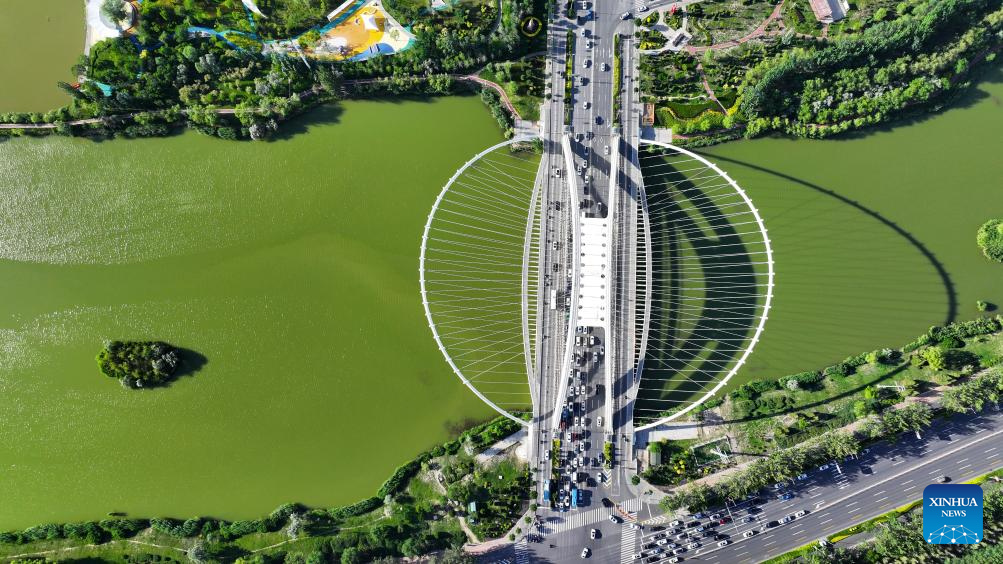 An aerial drone photo taken on June 23, 2024 shows a bridge over the Diannong River in Yinchuan, northwest China's Ningxia Hui Autonomous Region. (Xinhua/Wang Peng)