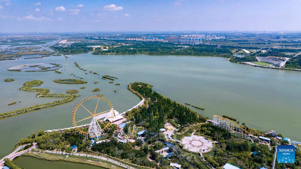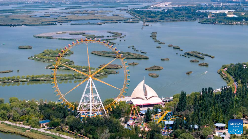 An aerial drone photo taken on Sept. 10, 2024 shows the scenery in Haibao park of Yinchuan, northwest China's Ningxia Hui Autonomous Region. (Xinhua/Yang Zhisen)