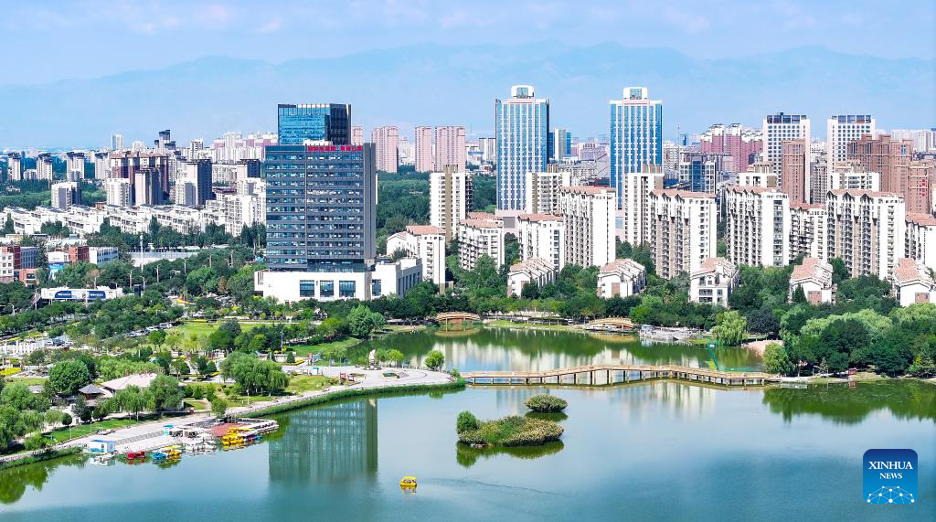 An aerial drone photo taken on Aug. 22, 2024 shows a view of Yinchuan City as seen from Lailong park in Xingqing District of Yinchuan, northwest China's Ningxia Hui Autonomous Region. (Xinhua/Yang Zhisen)