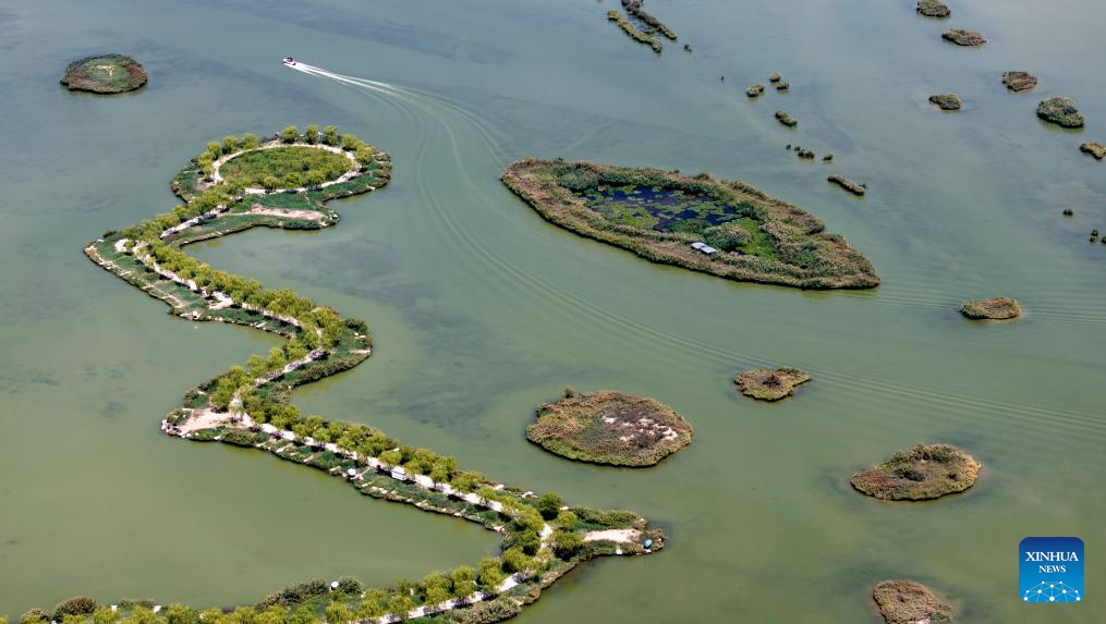 An aerial drone photo taken on Aug. 21, 2024 shows a view in the Baohu Lake national wetland park in Yinchuan, northwest China's Ningxia Hui Autonomous Region. (Xinhua/Feng Kaihua)