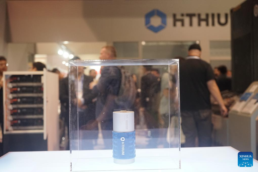 People visit the exhibition area of Chinese company Hithium Energy Storage during the RE+ 2024 expo in Anahiem, California, the United States, on Sept. 10, 2024. Over 300 Chinese companies participated in the RE+ 2024 expo, North America's largest clean energy event, this week with their latest products and technologies, seeking more market opportunities. (Photo by Zeng Hui/Xinhua)