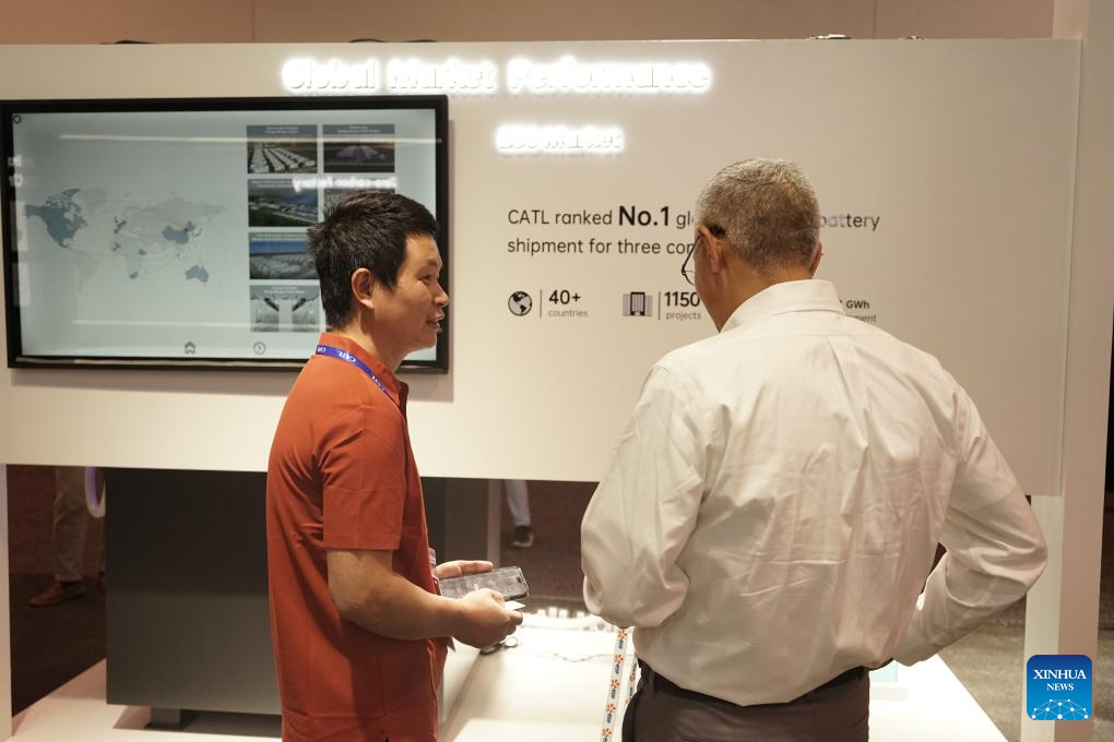 A staff member talks with a visitor in the exhibition area of Chinese company CATL during the RE+ 2024 expo in Anahiem, California, the United States, on Sept. 10, 2024. Over 300 Chinese companies participated in the RE+ 2024 expo, North America's largest clean energy event, this week with their latest products and technologies, seeking more market opportunities. (Photo by Zeng Hui/Xinhua)