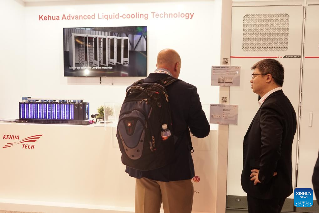 A staff member talks with a visitor in the exhibition area of Chinese company Kehua Digital Energy during the RE+ 2024 expo in Anahiem, California, the United States, on Sept. 10, 2024. Over 300 Chinese companies participated in the RE+ 2024 expo, North America's largest clean energy event, this week with their latest products and technologies, seeking more market opportunities. (Photo by Zeng Hui/Xinhua)