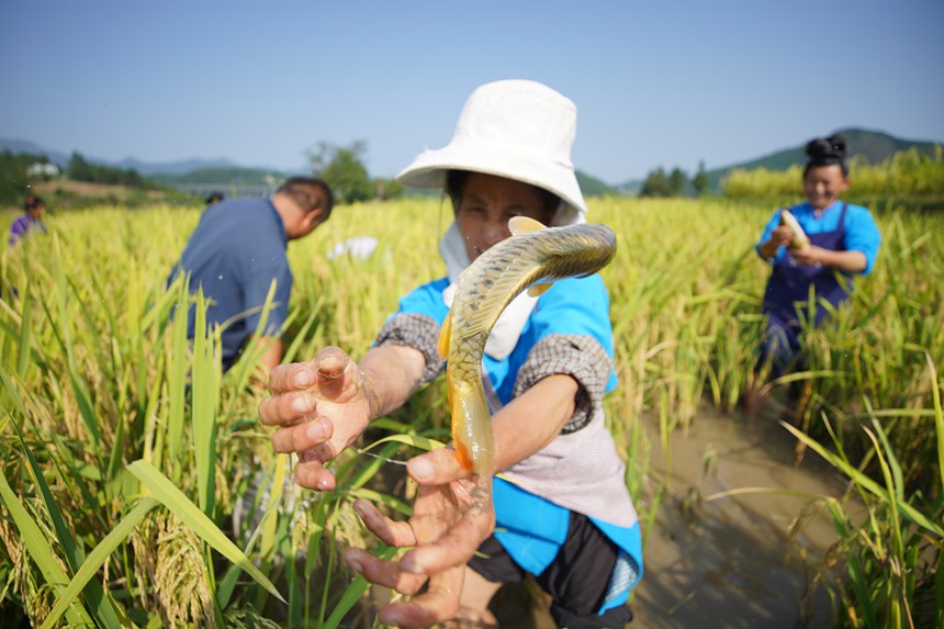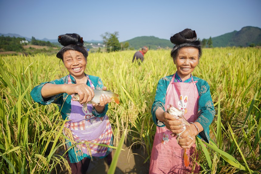In the golden autumn season, in the villages and fields of Danzhai county, Qiandongnan Miao and Dong Autonomous Prefecture, southwest China's Guizhou Province, a bountiful harvest with fragrant rice and plump fish is on display.