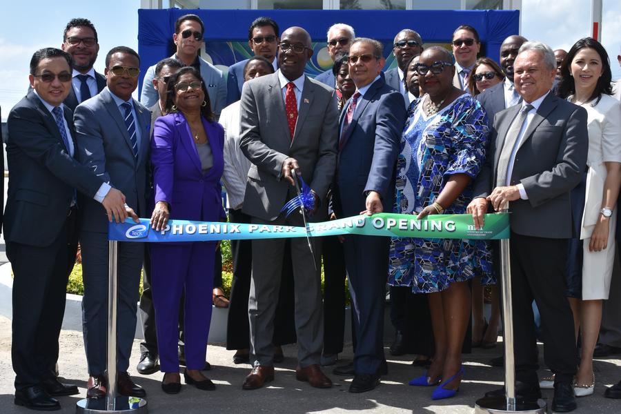Trinidad and Tobago's Prime Minister Keith Rowley (4th L, front), Foreign Minister Amery Browne (2nd L, front), Minister of Trade and Industry Paula Gopee-Scoon (3rd L, front), Chinese Ambassador to Trinidad and Tobago Fang Qiu (1st L, front) and other officials attend the launch ceremony of the Phoenix Park Industrial Estate in Point Lisas, the second-largest port in Trinidad and Tobago, Jan. 10, 2024. (Xinhua/Zhu Wanjun)
