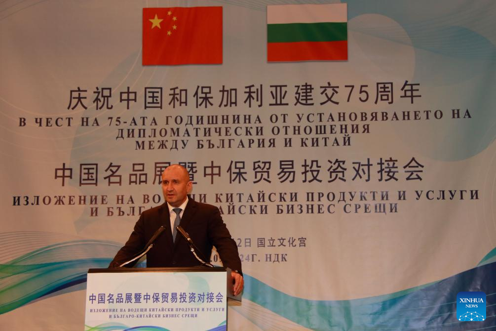 Bulgarian President Rumen Radev speaks at the opening ceremony of the "China Premium Products and Services Exhibition and Business Matchmaking" event in Sofia, Bulgaria, on Sept. 12, 2024. Senior government officials and business representatives of China and Bulgaria expressed their desire here on Thursday to deepen bilateral economic cooperation. (Photo by Marian Draganov/Xinhua)