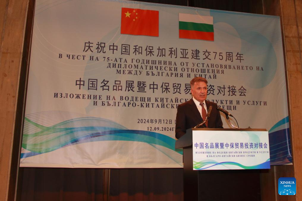 Petko Nikolov, Bulgaria's minister of economy and Industry, speaks at the opening ceremony of the "China Premium Products and Services Exhibition and Business Matchmaking" event in Sofia, Bulgaria, on Sept. 12, 2024. Senior government officials and business representatives of China and Bulgaria expressed their desire here on Thursday to deepen bilateral economic cooperation. (Photo by Marian Draganov/Xinhua)