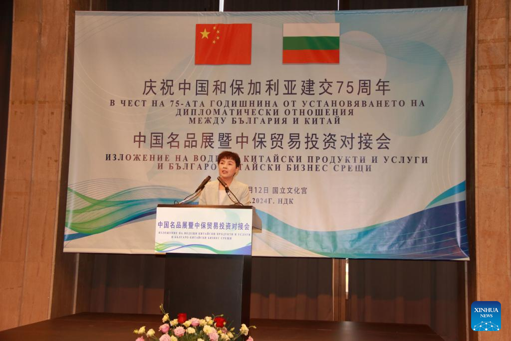 Chinese Ambassador to Bulgaria Dai Qingli speaks at the opening ceremony of the "China Premium Products and Services Exhibition and Business Matchmaking" event in Sofia, Bulgaria, on Sept. 12, 2024. Senior government officials and business representatives of China and Bulgaria expressed their desire here on Thursday to deepen bilateral economic cooperation. (Photo by Marian Draganov/Xinhua)