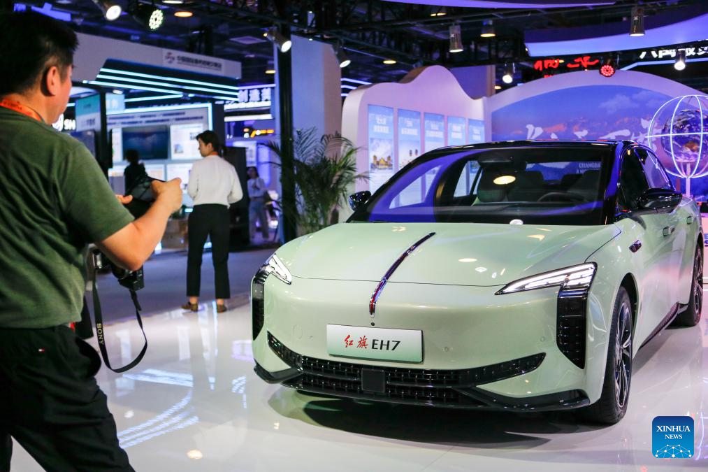 A visitor takes photo of a Hongqi EH7 new energy car during the 2024 China International Fair for Trade in Services (CIFTIS) at the China National Convention Center in Beijing, capital of China, Sept. 12, 2024. Themed "Global Services, Shared Prosperity," the 2024 CIFTIS opened at the China National Convention Center and the Shougang Park in Beijing on Thursday. (Xinhua/Ding Hongfa)