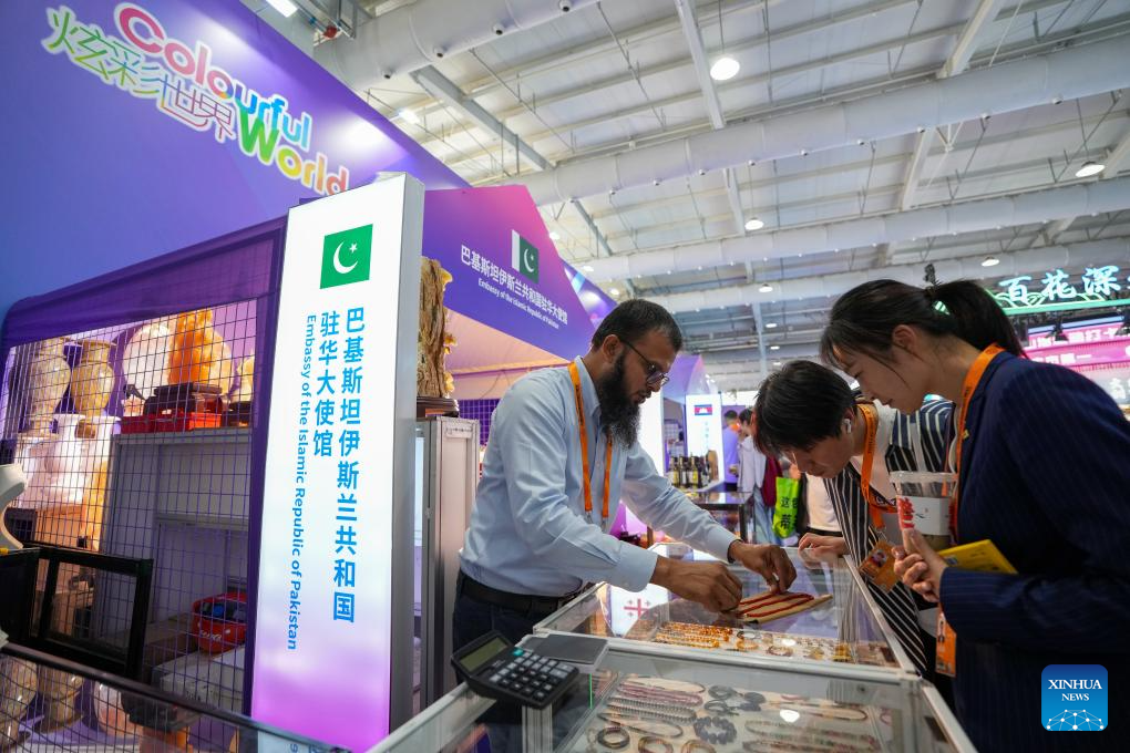 People visit the booth of Pakistan during the 2024 China International Fair for Trade in Services (CIFTIS) at the Shougang Park in Beijing, capital of China, Sept. 12, 2024. Themed "Global Services, Shared Prosperity," the 2024 CIFTIS opened at the China National Convention Center and the Shougang Park in Beijing on Thursday. (Xinhua/Ju Huanzong)
