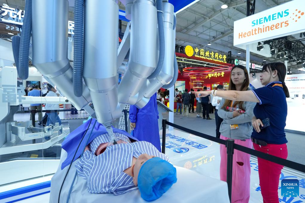 Visitors learn about a surgical robot during the 2024 China International Fair for Trade in Services (CIFTIS) at the Shougang Park in Beijing, capital of China, Sept. 12, 2024. Themed "Global Services, Shared Prosperity," the 2024 CIFTIS opened at the China National Convention Center and the Shougang Park in Beijing on Thursday. (Xinhua/Ju Huanzong)