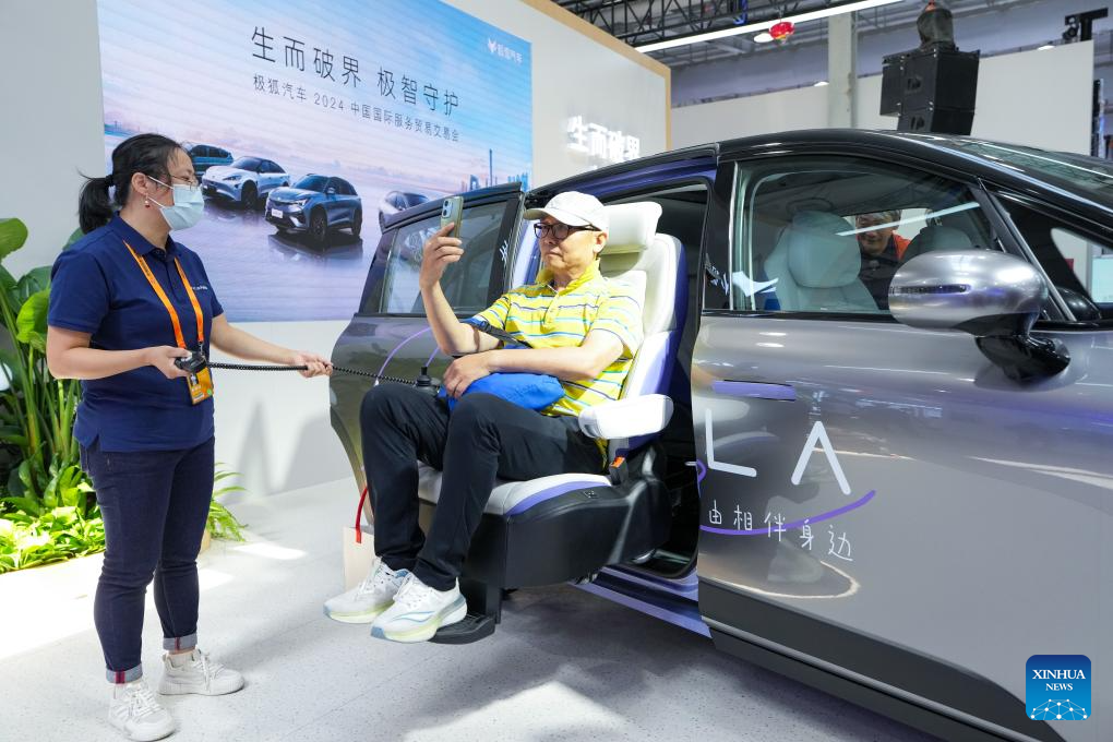 A visitor experiences an electric car during the 2024 China International Fair for Trade in Services (CIFTIS) at the Shougang Park in Beijing, capital of China, Sept. 12, 2024. Themed "Global Services, Shared Prosperity," the 2024 CIFTIS opened at the China National Convention Center and the Shougang Park in Beijing on Thursday. (Xinhua/Ju Huanzong)