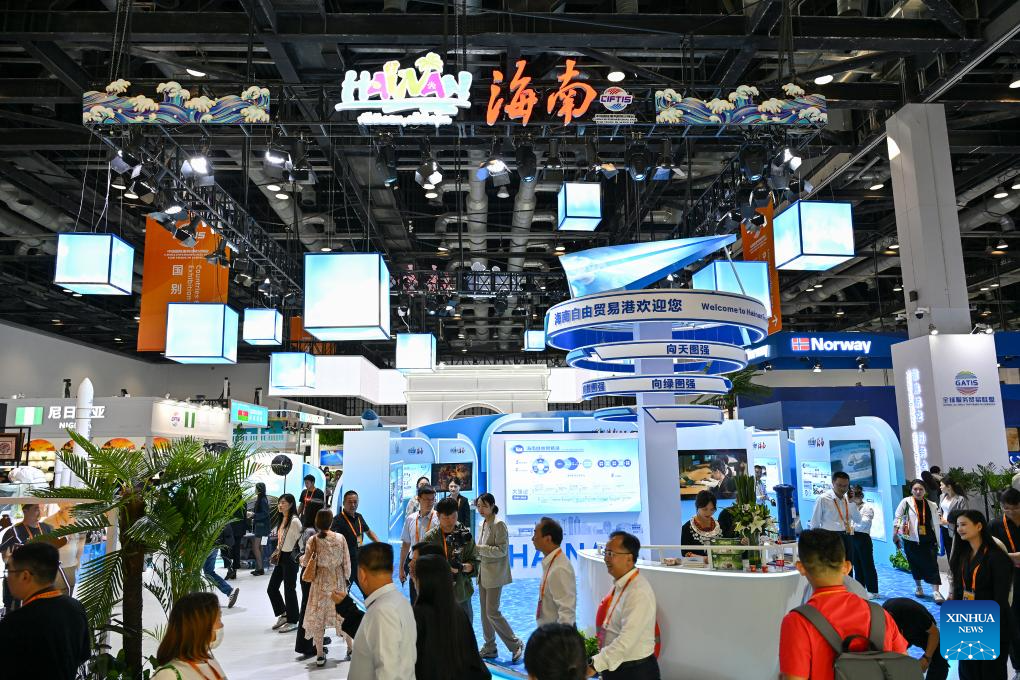This photo taken on Sept. 12, 2024 shows the booth of South China's Hainan Province during the 2024 China International Fair for Trade in Services (CIFTIS) at the China National Convention Center in Beijing, capital of China. Themed "Global Services, Shared Prosperity," the 2024 CIFTIS opened at the China National Convention Center and the Shougang Park in Beijing on Thursday. (Xinhua/Li Xin)