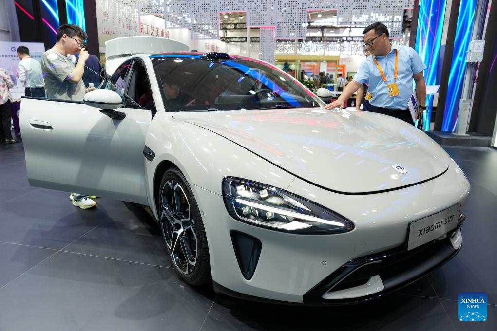 Visitors look at a Xiaomi SU7 during the 2024 China International Fair for Trade in Services (CIFTIS) at the Shougang Park in Beijing, capital of China, Sept. 12, 2024. Themed "Global Services, Shared Prosperity," the 2024 CIFTIS opened at the China National Convention Center and the Shougang Park in Beijing on Thursday. (Xinhua/Ju Huanzong)