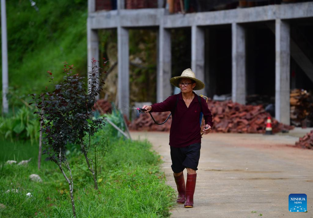 Liang Anhe performs pest-control for saplings at Wuying Village on the border between south China's Guangxi Zhuang Autonomous Region and southwest China's Guizhou Province, July 8, 2020. (Xinhua/Huang Xiaobang)