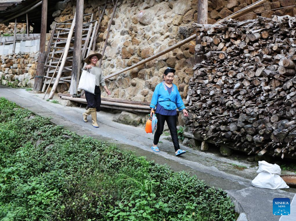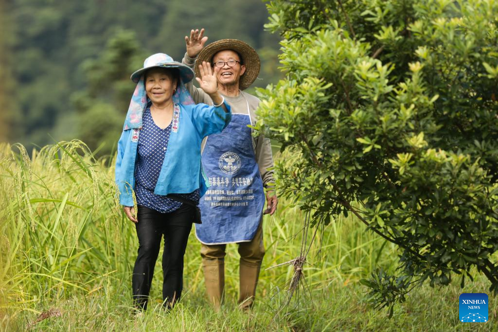 Liang Anhe (R) and his wife Liang Yingmi wave to the photographer at Wuying Village on the border between south China's Guangxi Zhuang Autonomous Region and southwest China's Guizhou Province, Sept. 11, 2024. (Xinhua/Zheng Huansong)