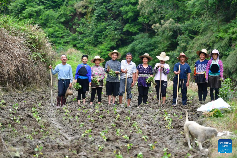 Liang Anhe (1st L) and Liang Xiuqian (4th L) pose for a photo with villagers at a sweet potato field at Wuying Village on the border between south China's Guangxi Zhuang Autonomous Region and southwest China's Guizhou Province, May 24, 2019. (Xinhua/Huang Xiaobang)
