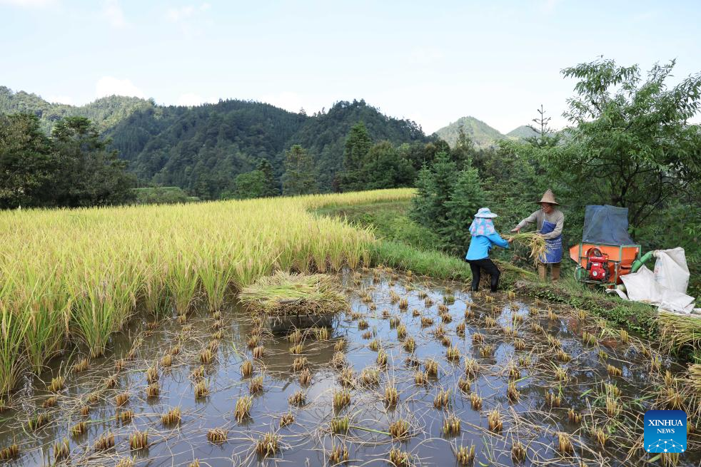 Liang Anhe (L) and his wife Liang Yingmi harvest paddy rice at Wuying Village on the border between south China's Guangxi Zhuang Autonomous Region and southwest China's Guizhou Province, Sept. 11, 2024. (Xinhua/Jin Haoyuan)