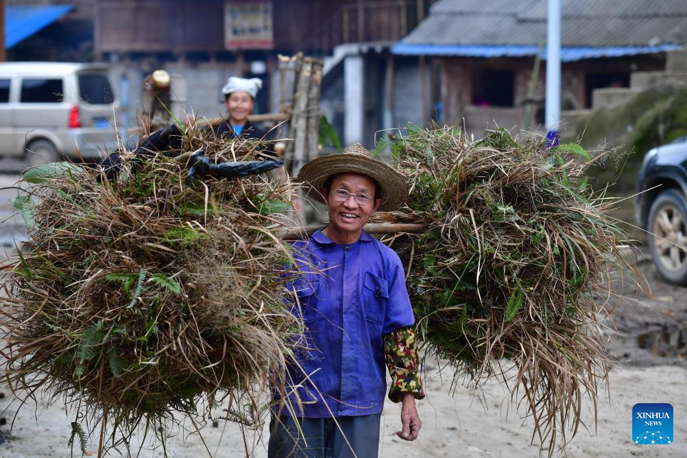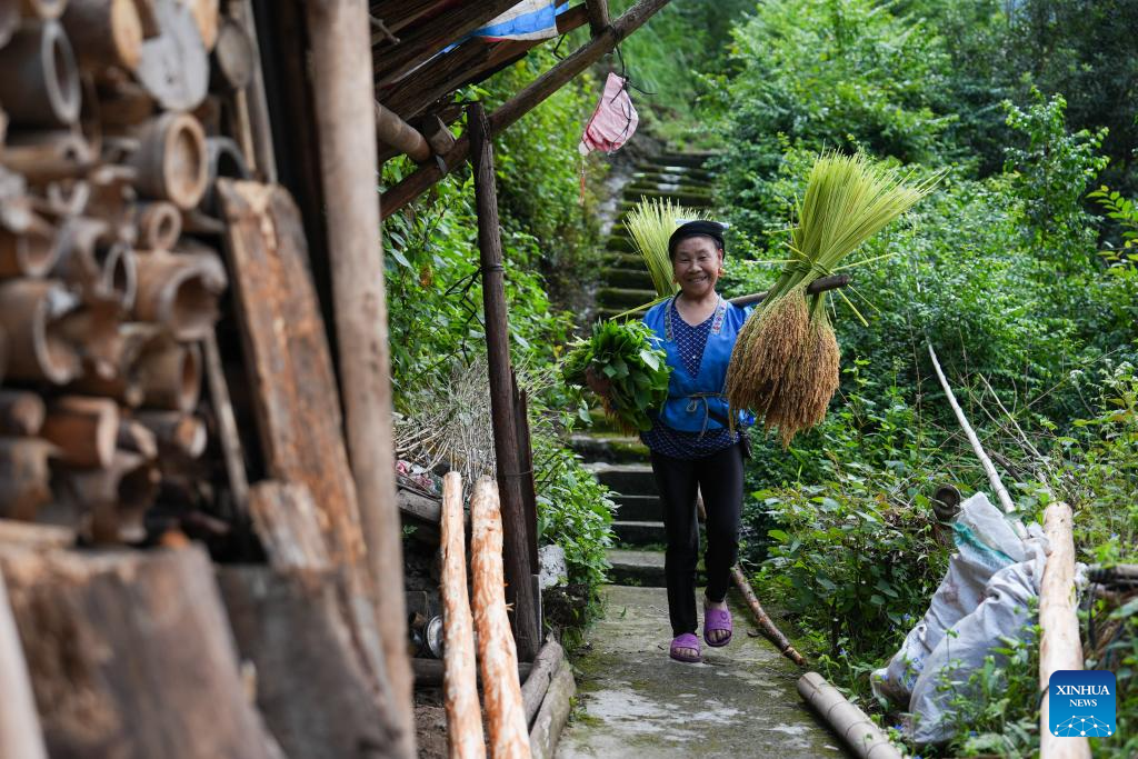 Liang Anhe's wife Liang Yingmi return home after harvesting paddy rice at Wuying Village on the border between south China's Guangxi Zhuang Autonomous Region and southwest China's Guizhou Province, Sept. 11, 2024. (Xinhua/Zheng Huansong)