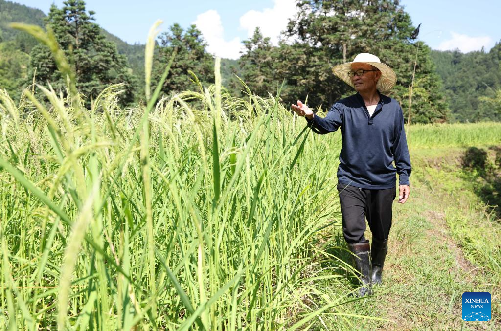 Liang Anhe checks the growth of paddy rice at Wuying Village on the border between south China's Guangxi Zhuang Autonomous Region and southwest China's Guizhou Province, April 3, 2024. (Xinhua/Jin Haoyuan)