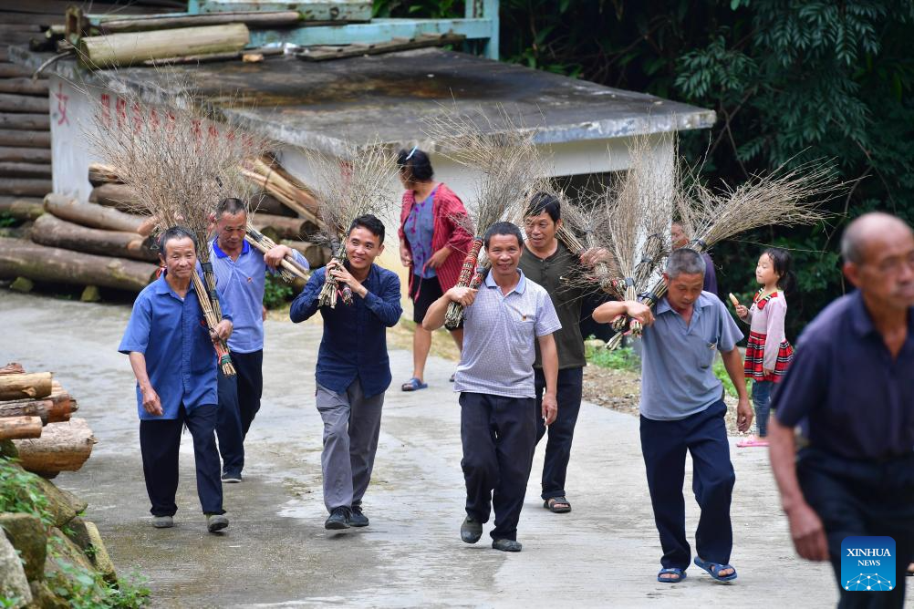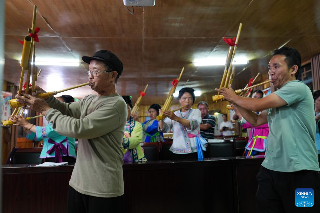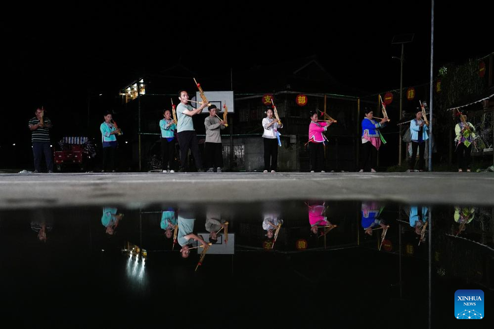 Liang Xiuqian (1st L) organizes a Lusheng assembly contest at Wuying Village on the border between south China's Guangxi Zhuang Autonomous Region and southwest China's Guizhou Province, July 11, 2024. (Xinhua/Huang Xiaobang)