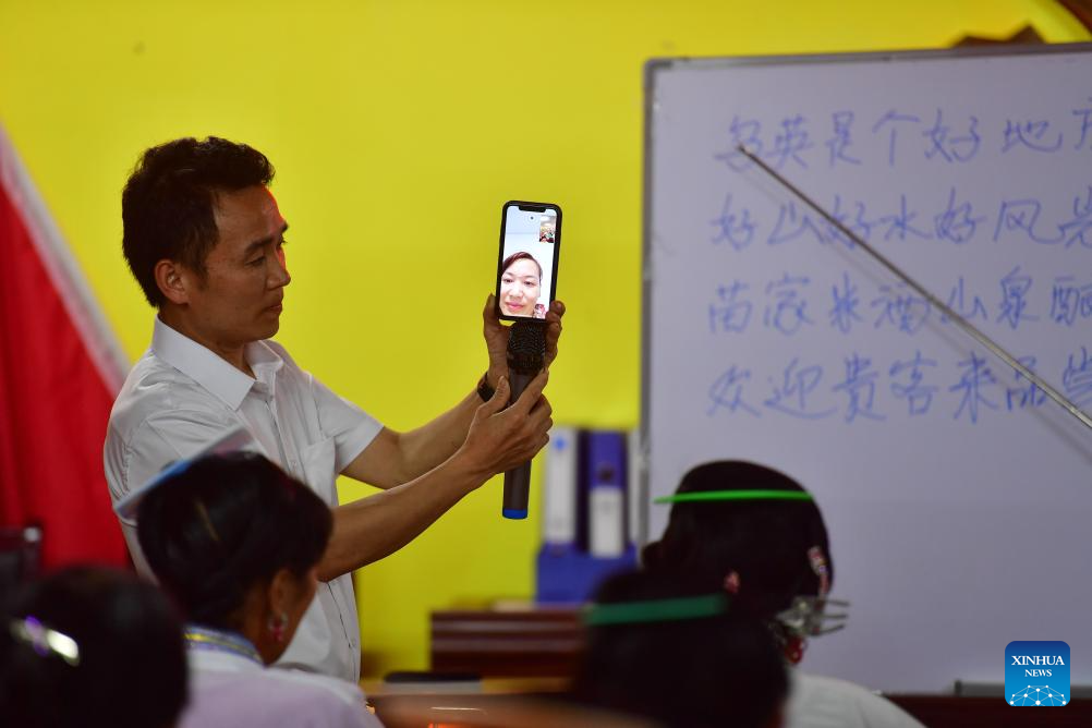 Liang Xiuqian arranges an online lecture via a mobile phone for female students at a night school at Wuying Village on the border between south China's Guangxi Zhuang Autonomous Region and southwest China's Guizhou Province, June 22, 2020. (Xinhua/Huang Xiaobang)