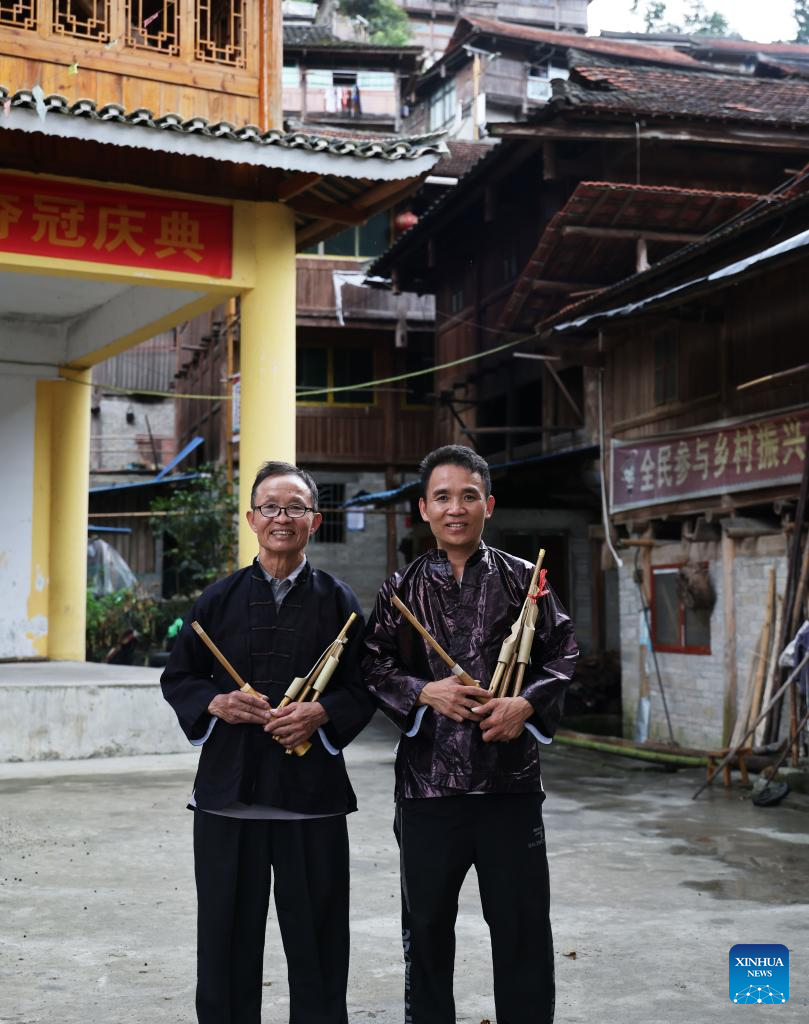 As a teacher at the women's night school, the senior Liang guides students there in learning, tree planting, and event hosting. The junior Liang, for his part, spearheads with the local Lusheng (a traditional reed-pipe wind instrument) team as it wins honor for the village from various art competitions. (Xinhua/Huang Xiaobang)